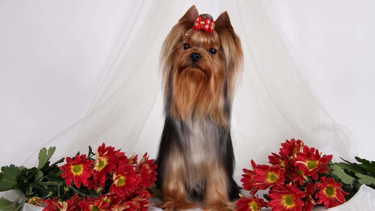 Wallpaper Yorkshire Terrier with chrysanthemum flowers
