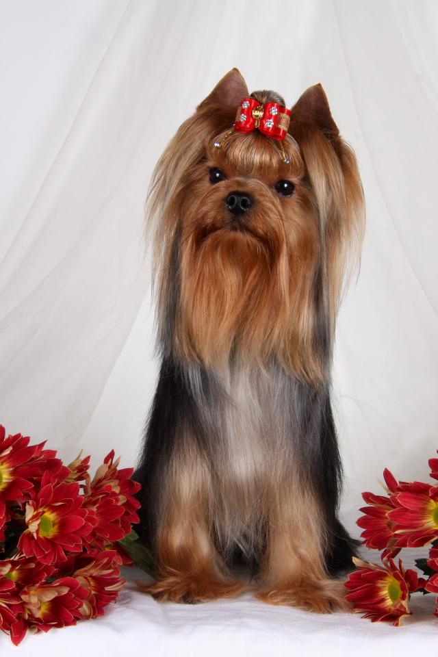 Wallpaper Yorkshire Terrier with chrysanthemum flowers
