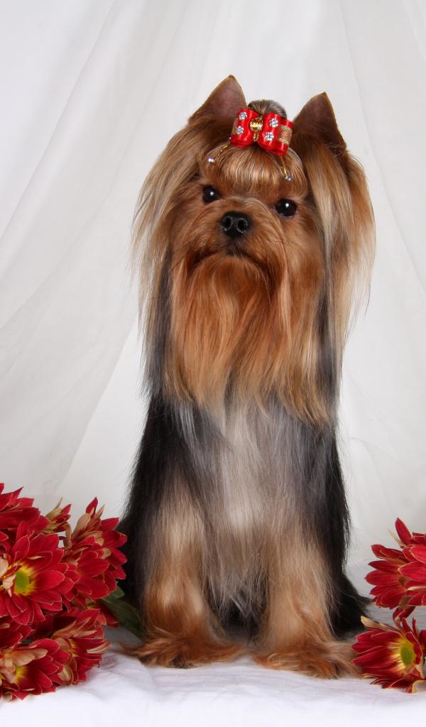 Wallpaper Yorkshire Terrier with chrysanthemum flowers