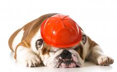 Wallpaper A sleeping bulldog in a helmet on a white background