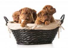 Wallpaper Puppies of a bulldog in a basket on a white background
