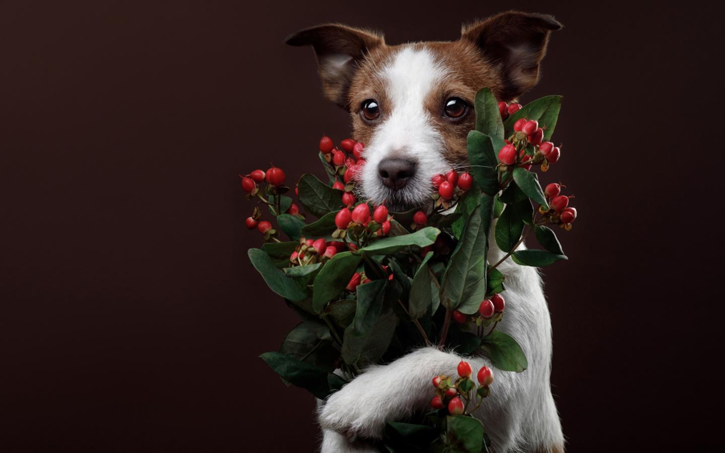 Wallpaper Jack cleared the terrier with berries on a brown background