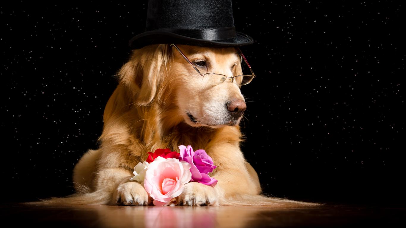 Wallpaper Golden retriever in a black hat with flowers