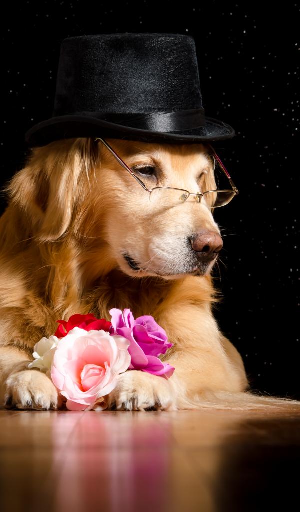 Wallpaper Golden retriever in a black hat with flowers
