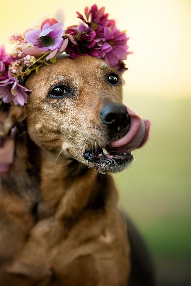 Wallpaper A dog with his tongue hanging out and a wreath on his head