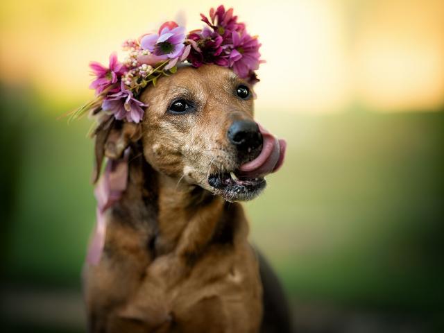 Wallpaper A dog with his tongue hanging out and a wreath on his head