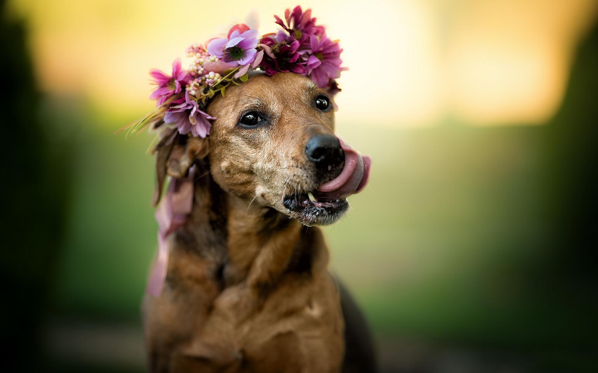 Wallpaper A dog with his tongue hanging out and a wreath on his head