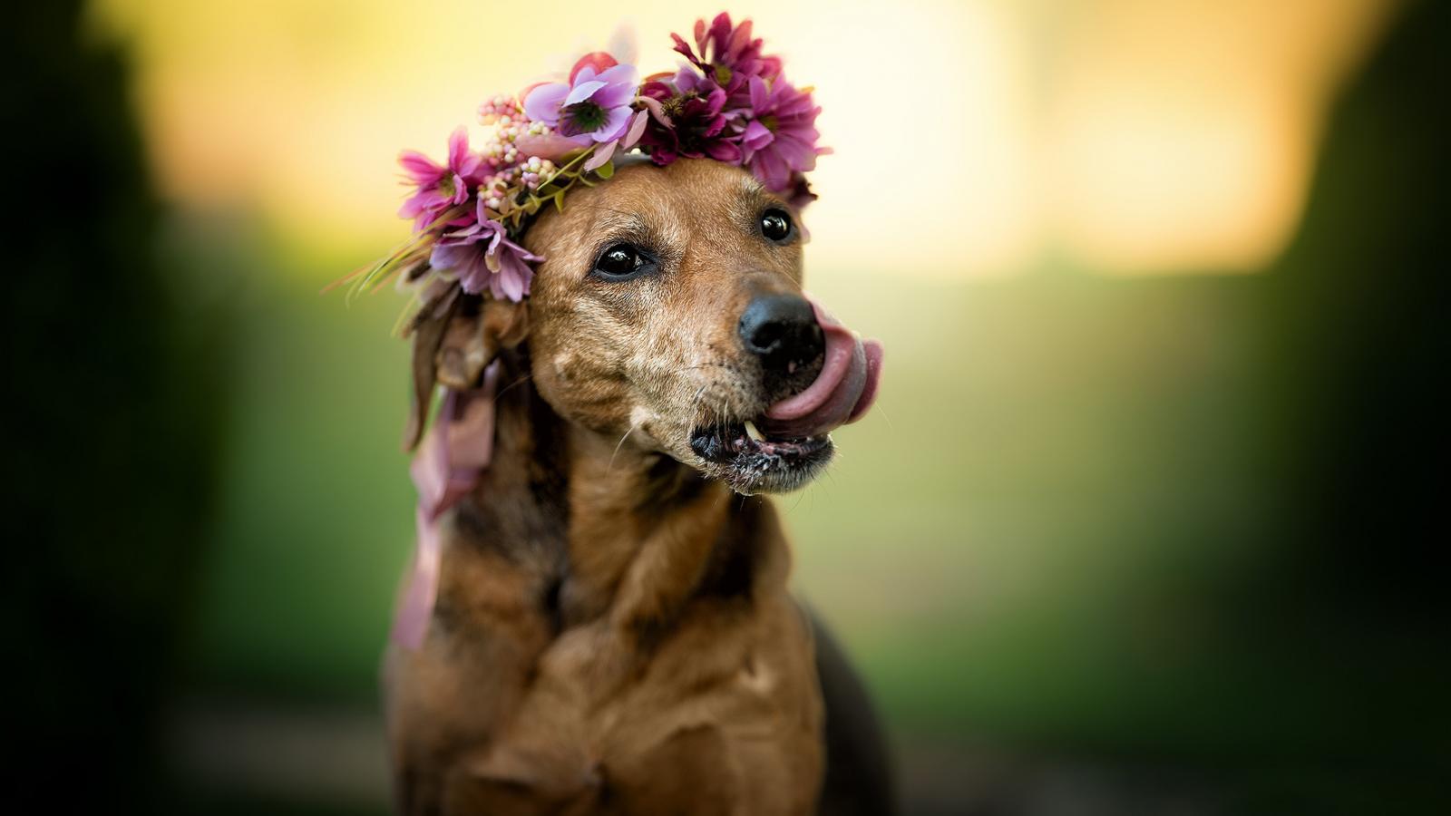 Wallpaper A dog with his tongue hanging out and a wreath on his head