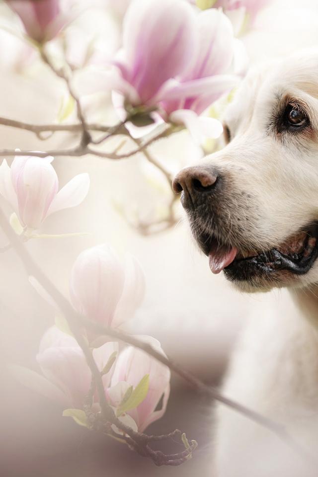 Wallpaper Golden Retriever with tongue out in pink colors