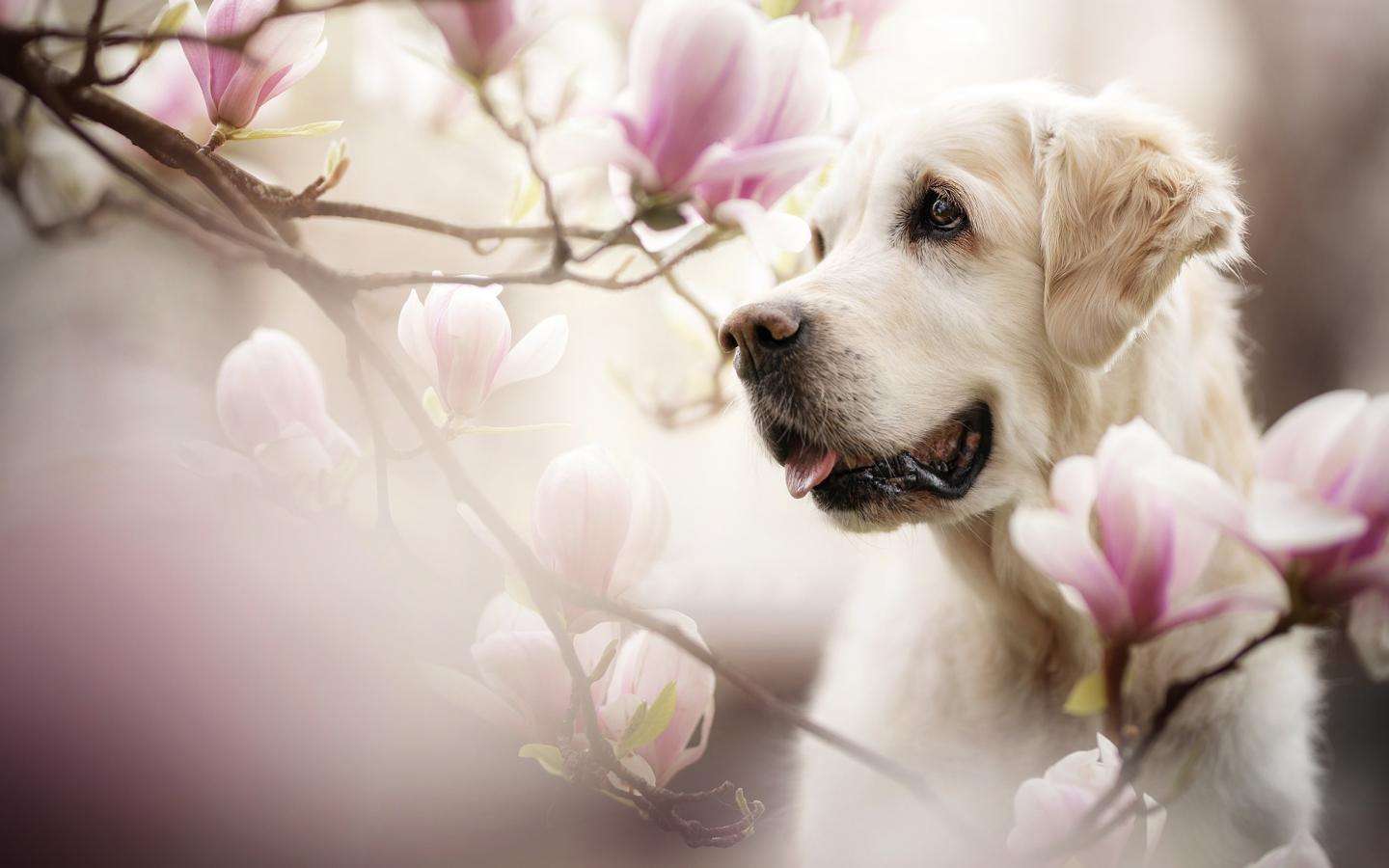 Wallpaper Golden Retriever with tongue out in pink colors