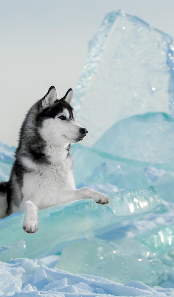 Wallpaper A dog of the Husky breed lies on a blue ice floe