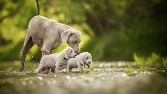 Wallpaper Weimaraner dog with two pups walking on water