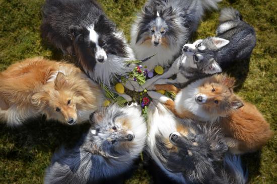 Wallpaper Four dogs breed Labrador, Border Collie, Retriever, Spaniel sit on the grass
