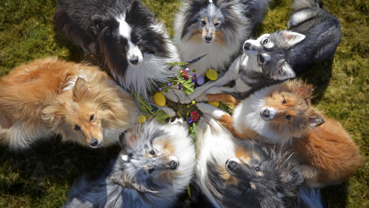 Wallpaper Four dogs breed Labrador, Border Collie, Retriever, Spaniel sit on the grass