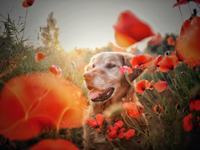 Wallpaper Golden Retriever in the colors of the red poppy