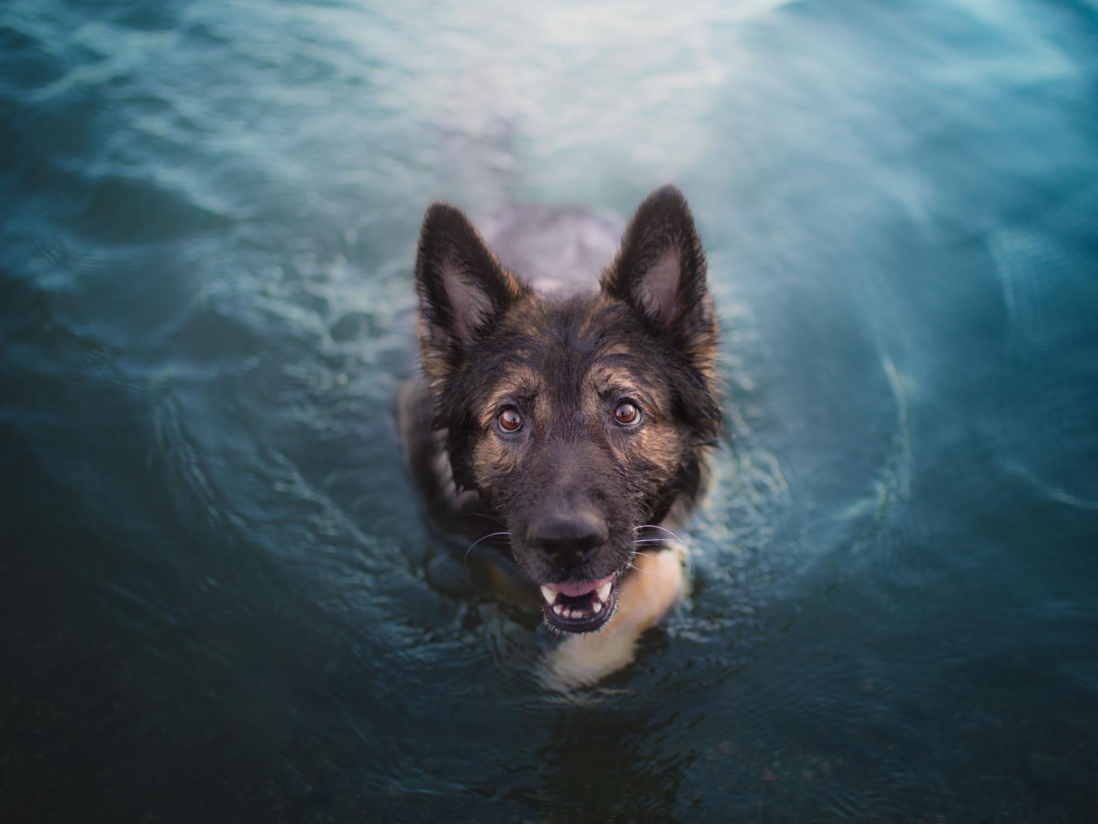 Wallpaper German Shepherd in the water looks at the owner