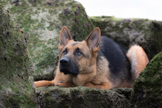Wallpaper Smart German Shepherd lies on a rock