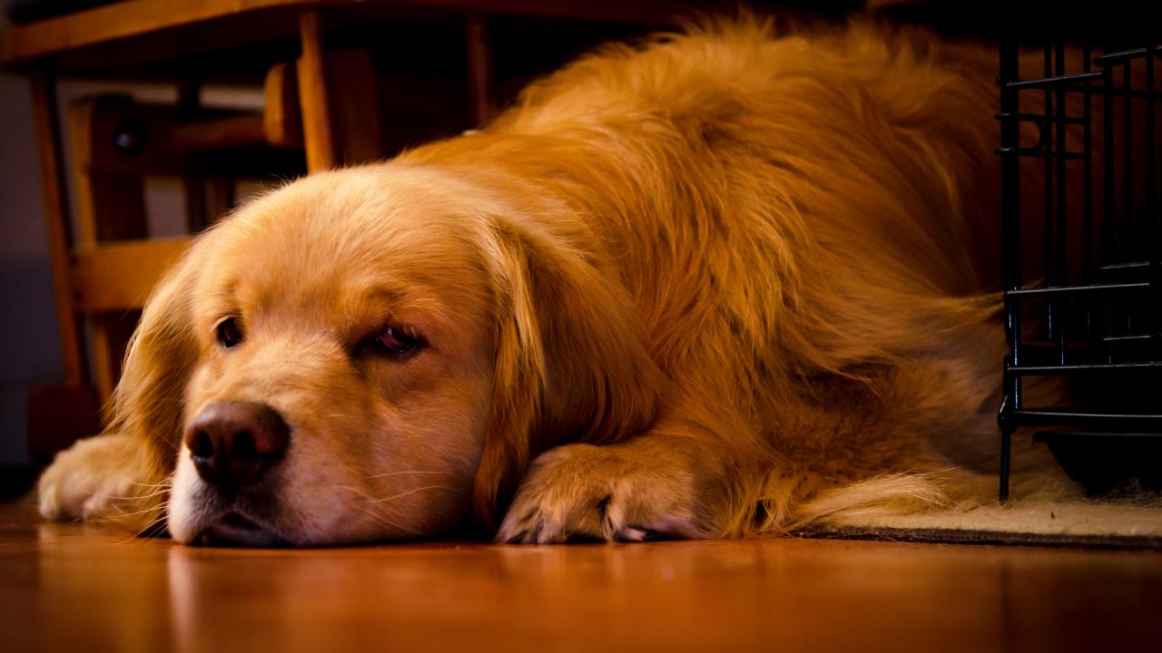 Wallpaper A sad golden retriever lies under the table