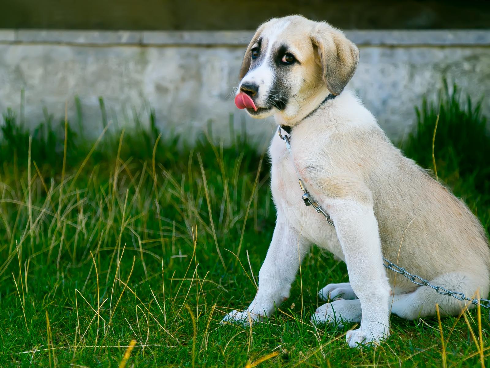 Wallpaper Little puppy with tongue out on the chain