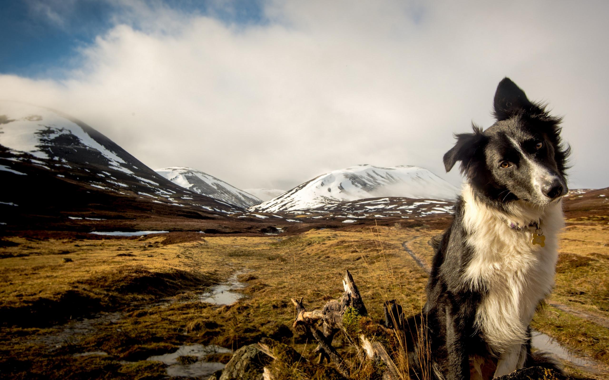 Wallpaper Australian Shepherd on a background of snow-capped mountains