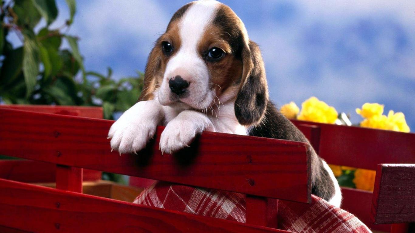 Wallpaper Little beagle puppy sitting in a box