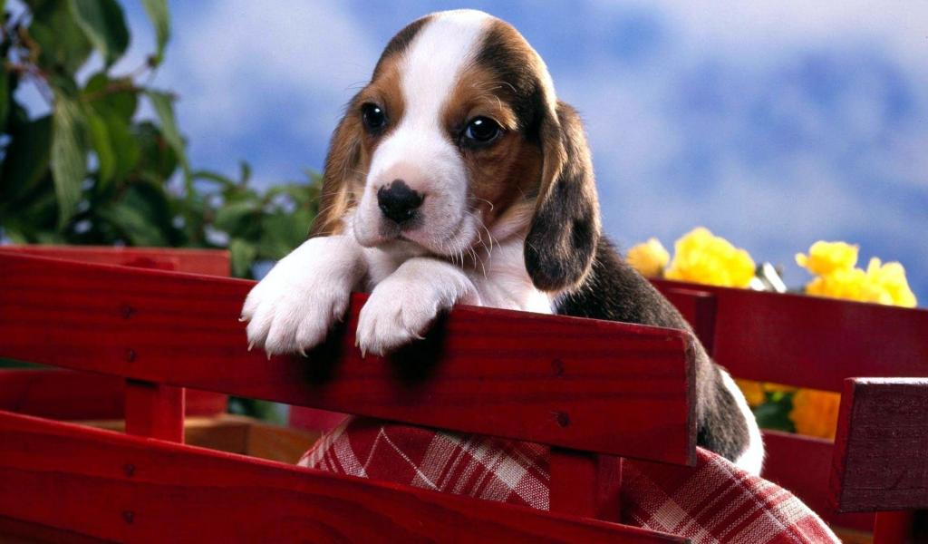 Wallpaper Little beagle puppy sitting in a box