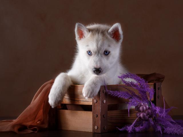 Wallpaper Little beautiful husky puppy in a wooden box