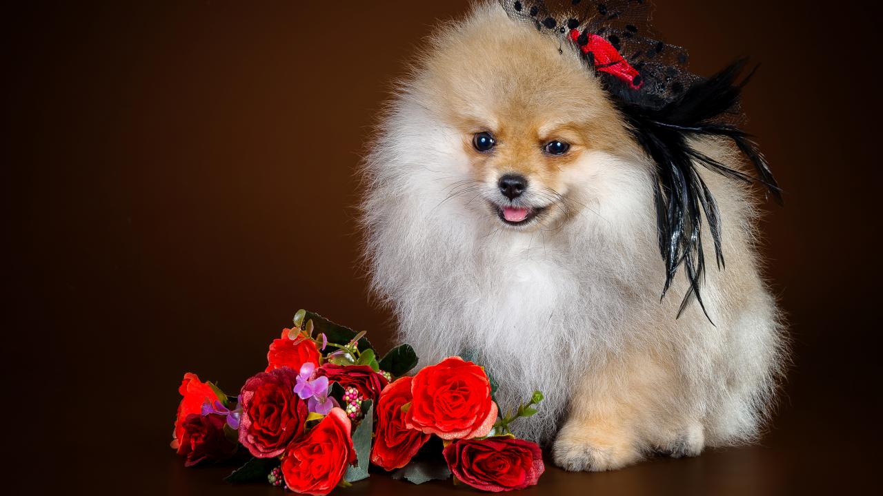» Wallpaper Cute Spitz in a hat with a bouquet