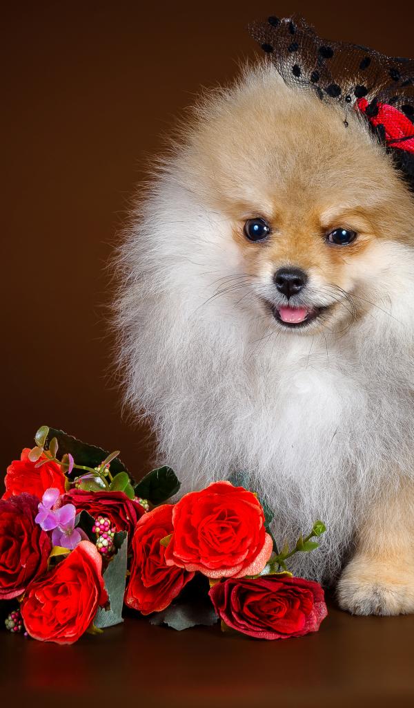 » Wallpaper Cute Spitz in a hat with a bouquet
