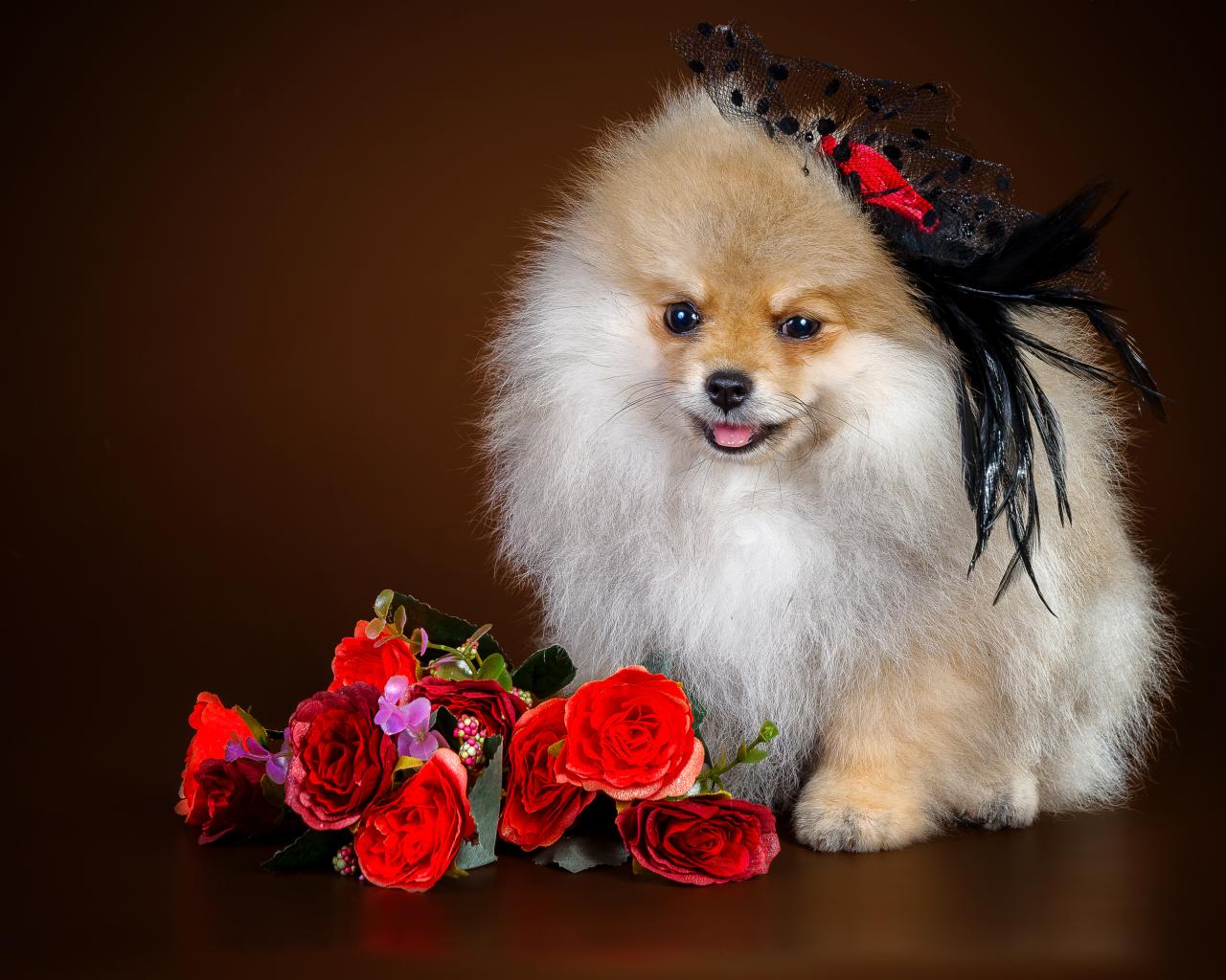 » Wallpaper Cute Spitz in a hat with a bouquet