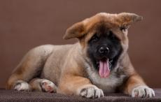 Wallpaper Akita Inu puppy with tongue hanging out on a blue background with a bouquet of flowers