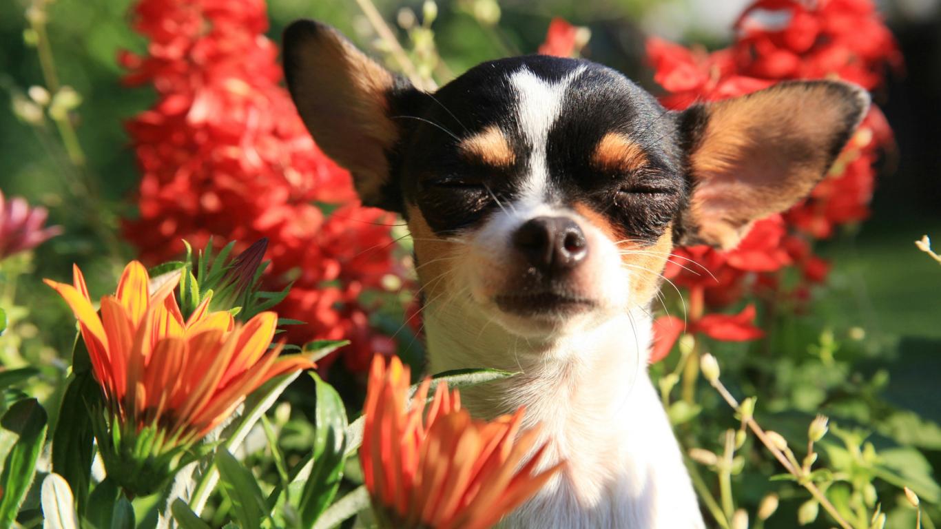 Wallpaper Chihuahua dog breed with eyes closed in flowers