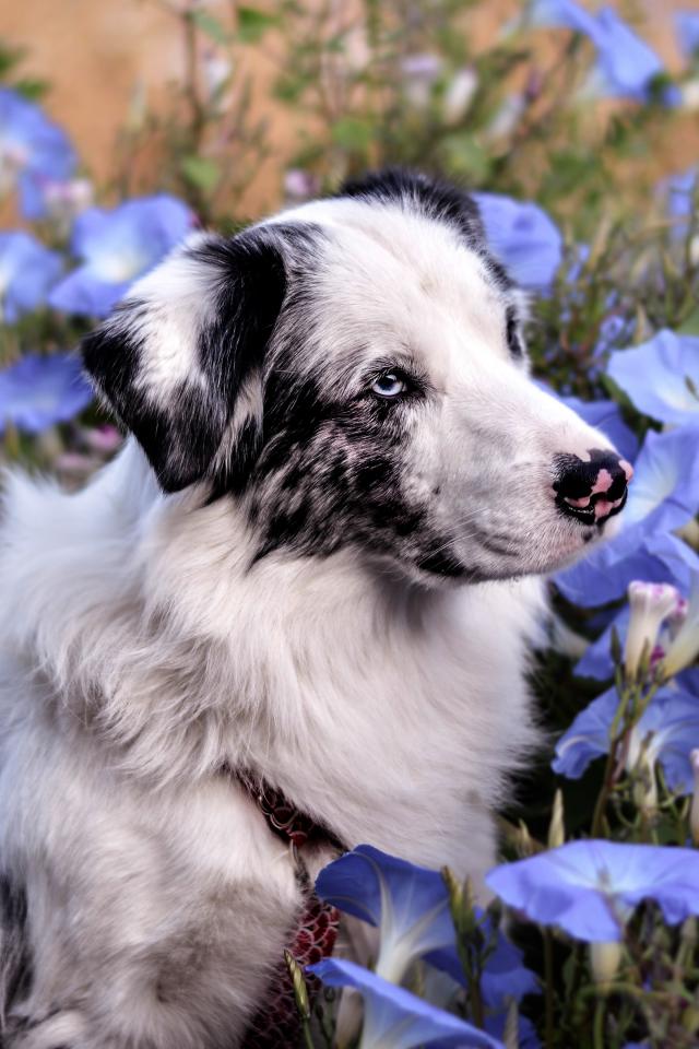 Wallpaper Australian Shepherd sits in ipomoea flowers