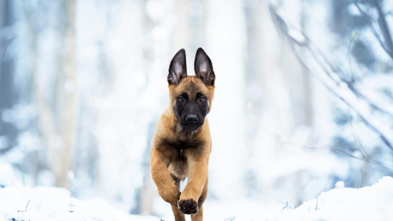 Wallpaper Belgian Shepherd Malinois runs on white snow