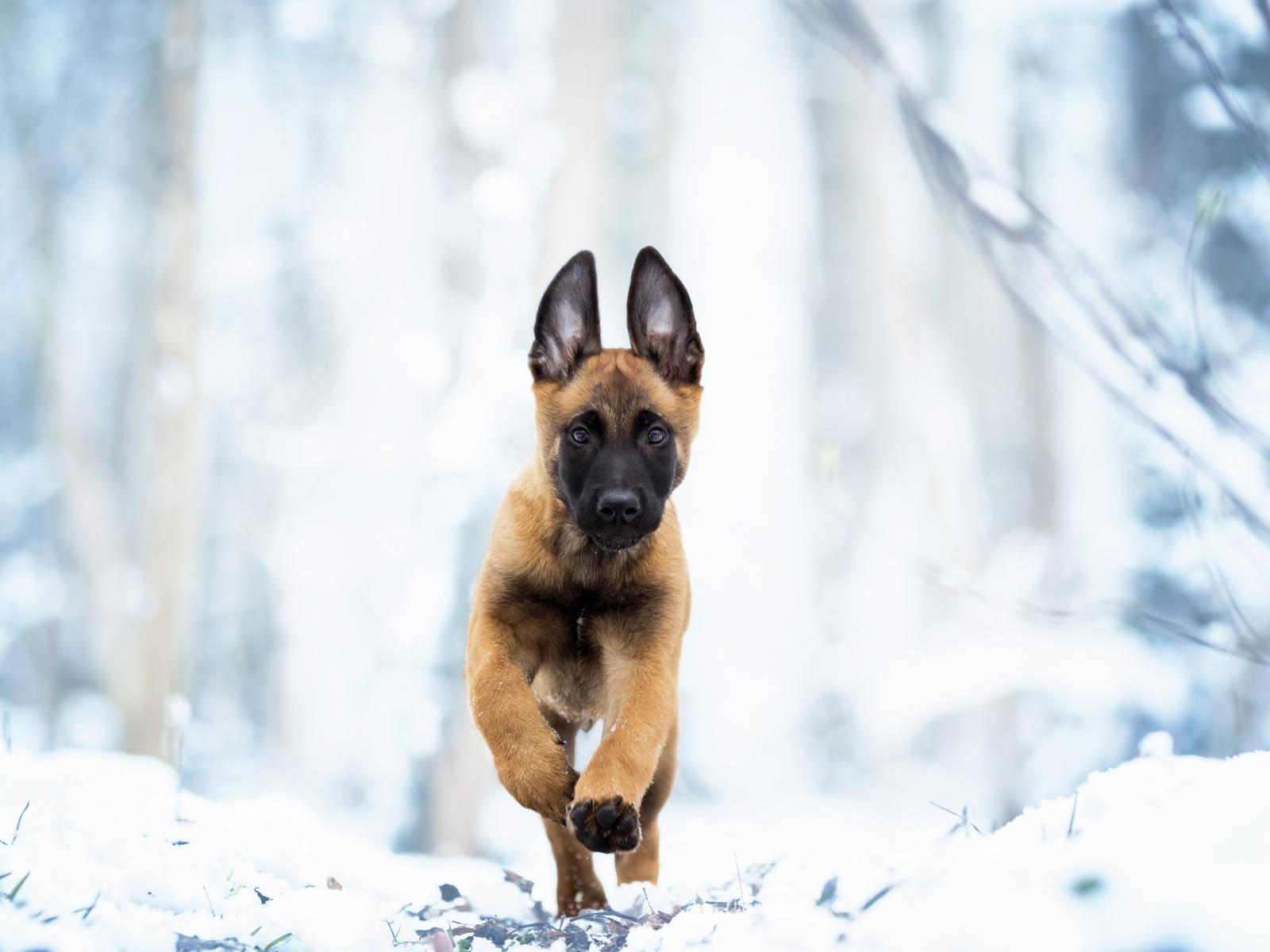 Wallpaper Belgian Shepherd Malinois runs on white snow