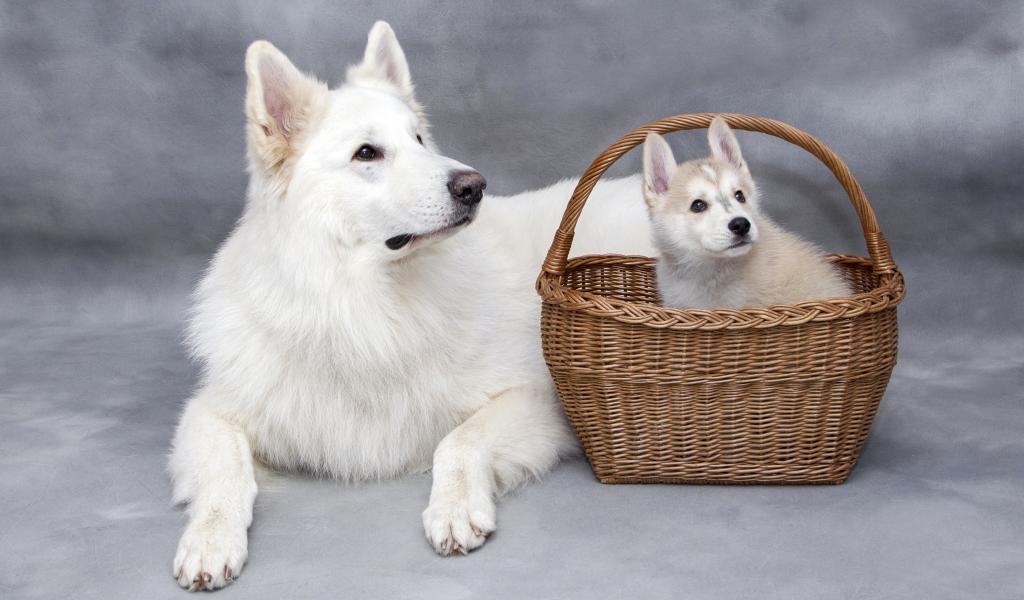 Wallpaper White husky with a puppy in a basket on a gray background