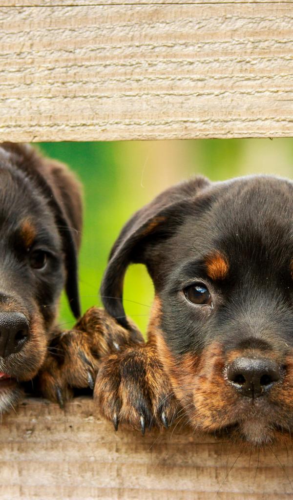 Wallpaper Two curious rottweiler puppies are watching the fence.
