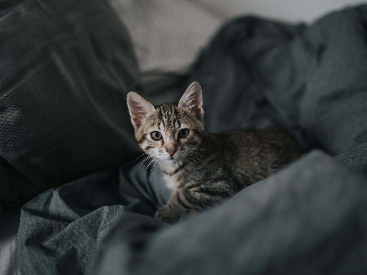 Wallpaper Cute gray kitten lying on a gray bedspread