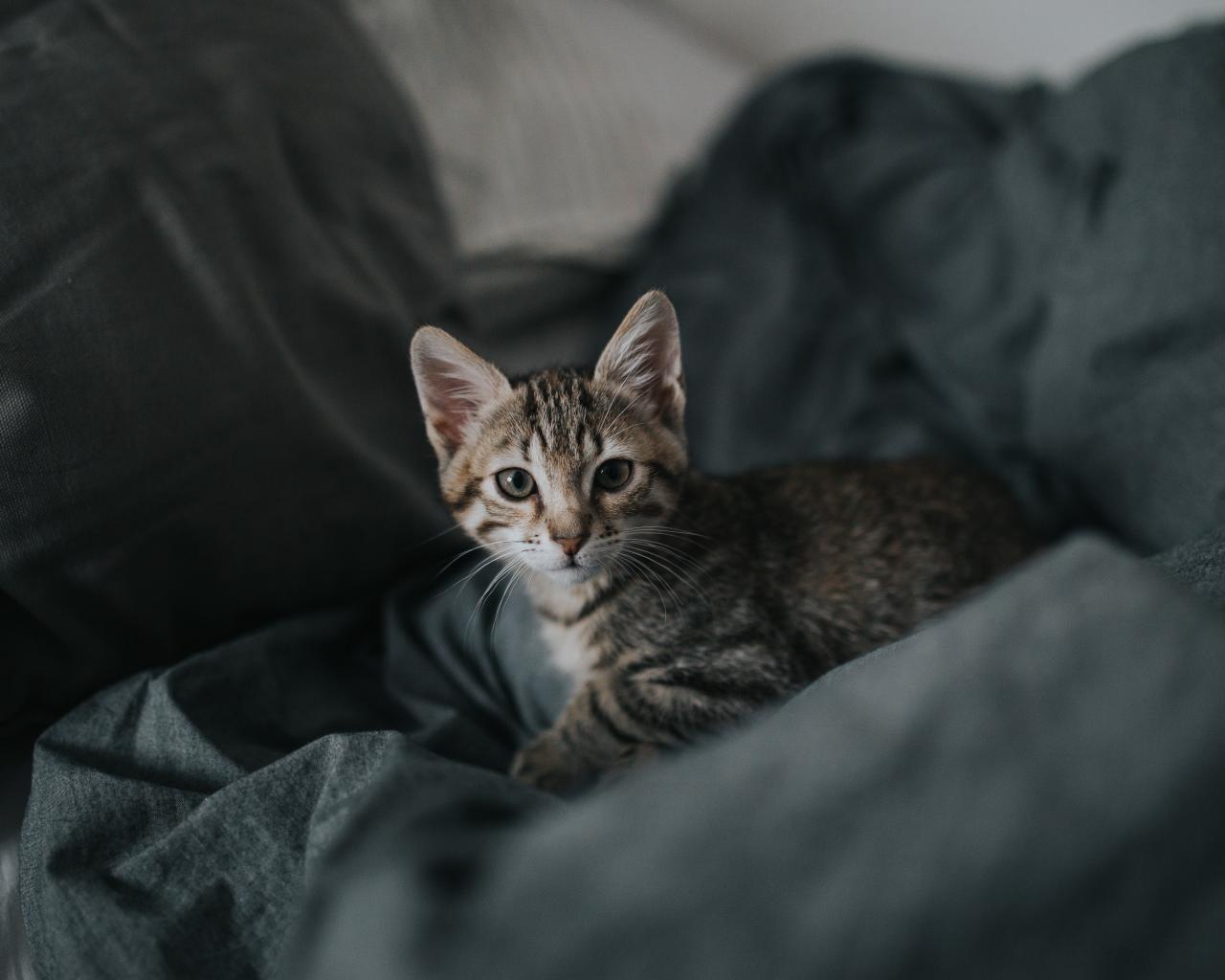 Wallpaper Cute gray kitten lying on a gray bedspread