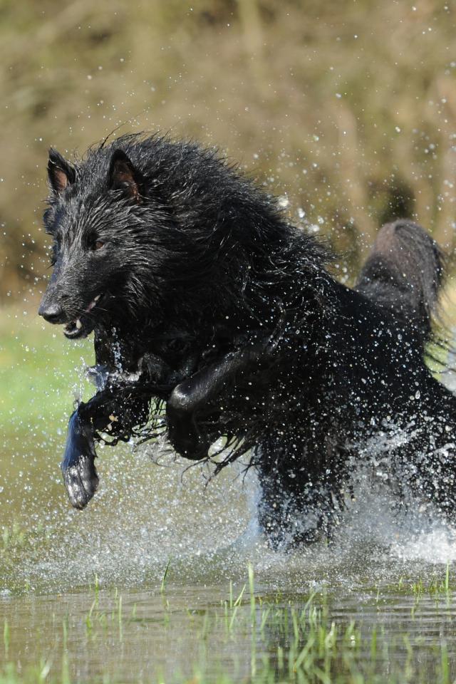 Wallpaper Black Belgian Shepherd running through the water