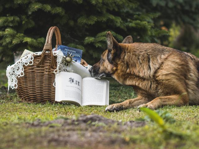Wallpaper German shepherd lying on the green grass with a book