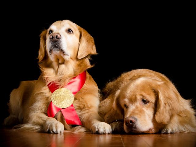 Wallpaper Two golden retriever on the floor on a black background