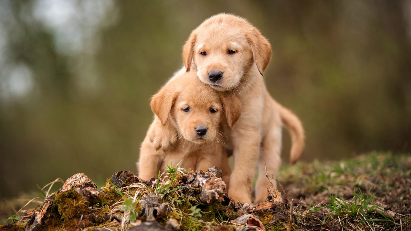 Wallpaper Two little golden retriever puppies are sitting on the ground
