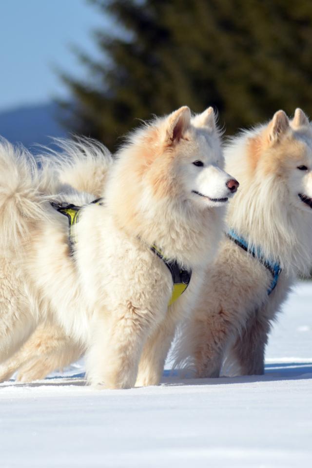 Wallpaper Two beautiful fluffy white Samoyeds on the snow