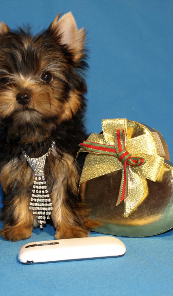 Wallpaper Little Yorkshire Terrier with a box on a blue background