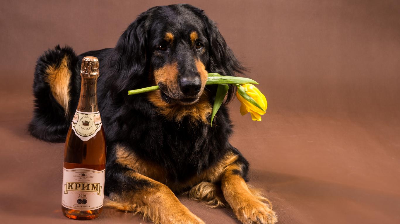 Wallpaper Dog breed Hovawart with champagne and a tulip in his teeth