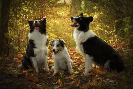 Wallpaper Three dogs of Border Collie breed in the autumn forest