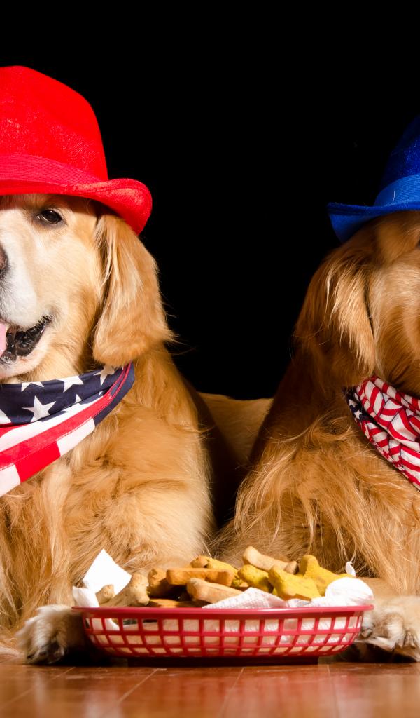 Wallpaper Two golden retriever in hats on a black background