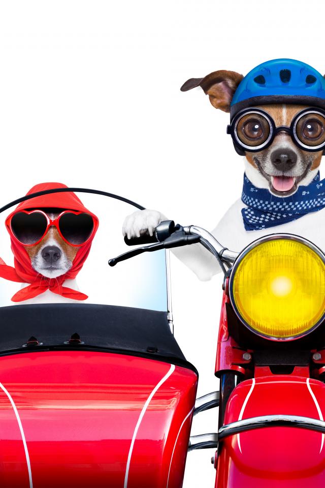 Wallpaper Two funny dogs on a motorcycle on a white background