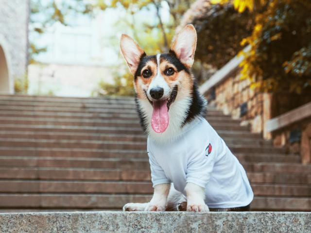 Wallpaper Welsh Corgi with tongue hanging out sits on the steps
